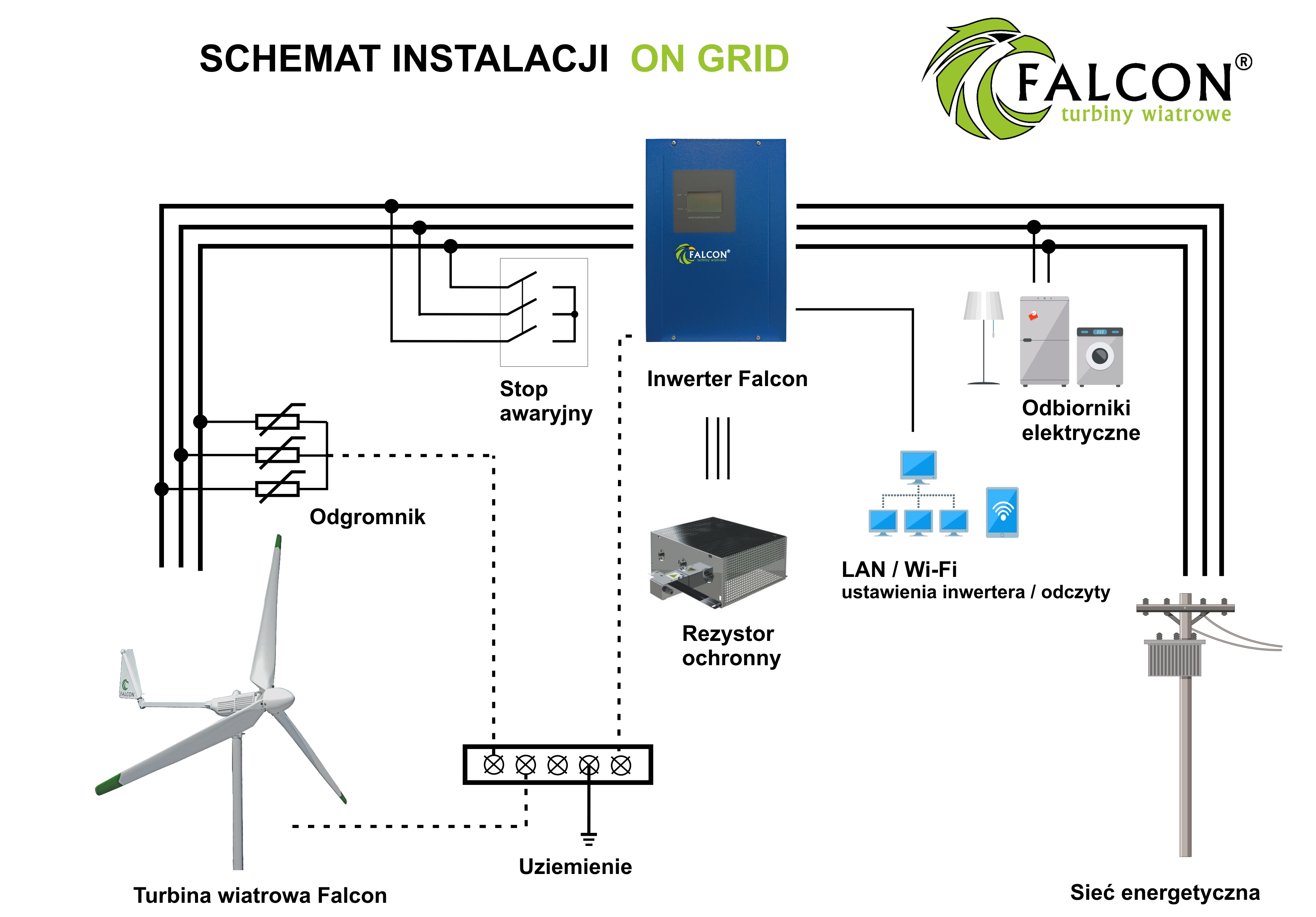 b. Ułożenie instalacji elektrycznej dla turbiny oraz instalacji odgromowej. Profesjonalnie przygotowana instalacja elektryczna i odgromowa zapewnia bezpieczne i wydajne użytkowanie turbiny wiatrowej przez wiele lat. Ze względu na konieczność poświadczenia u dostawcy energii montażu tej instalacji przez uprawnionego elektryka, sugerujemy wykonanie tego etapu przez Państwa elektryka lub przez naszych doświadczonych instalatorów turbin Falcon.