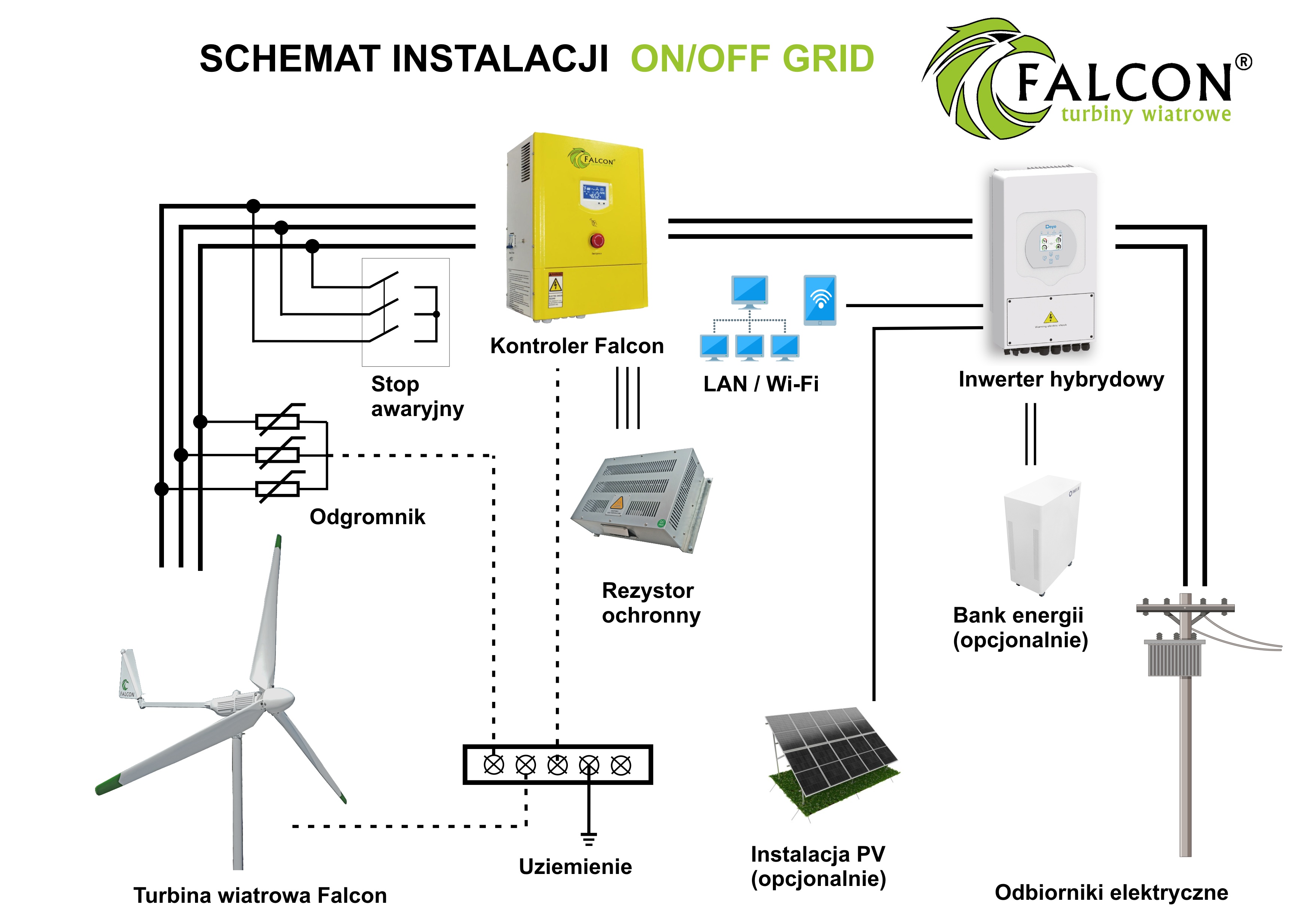 Turbiny Falcon posiadają bardzo wydajne generatory produkujące napięcie 230V - 400V. Pozwala to na wprowadzenie wyprodukowanej energii elektrycznej do sieci domowej. Nadwyżkę energii można sprzedać wprowadzając ją do zewnętrznej sieci energetycznej.
