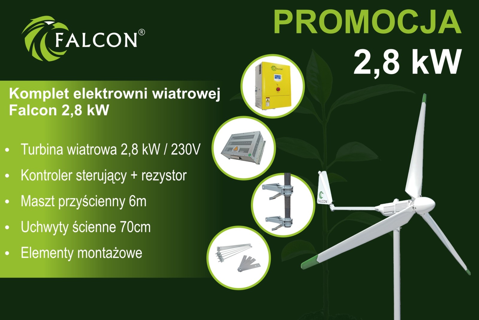 Gotowy zestaw elektrowni wiatrowej 2,8 kWZestaw zawiera:FNSW03: Turbina wiatrowa Falcon 2,8 kW/230VFNCR03: Kontroler turbiny + rezystor hamujący dla turbiny 2,8 kWFNM02: Maszt przyścienny 6mbFNM01XL: Mocowania do ściany , komplet 2 x70cm + gumy amortyzująceFNM03: Kompletny zestaw montażowy - kotwy, płaskowniki oraz pręty gwintowane z nakrętkami